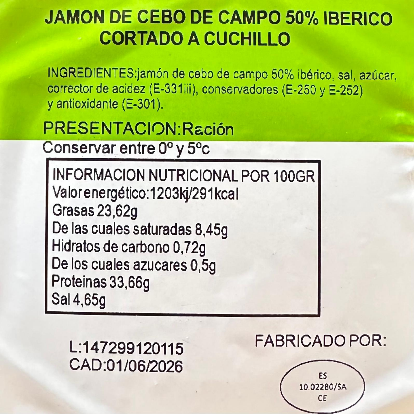Jamón de Cebo de Campo Ibérico 50% Raza Ibérica 100 gr.